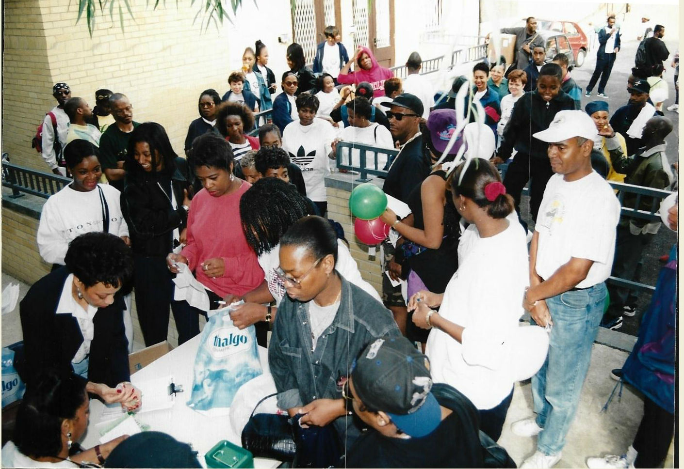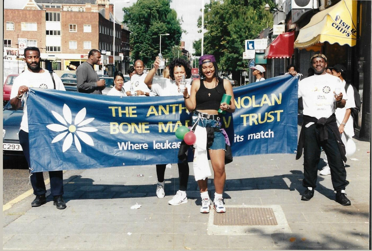 Participants signing up at the start of the first sponsored walk outside of The Anthony Nolan Bone Marrow Trust in London in September 1996.