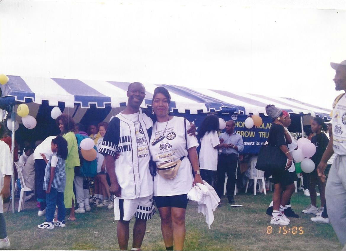 Alex and Jackie Lilly on Streatham Common in front of the marquee with participants and supporters at the end of the first sponsored walk.