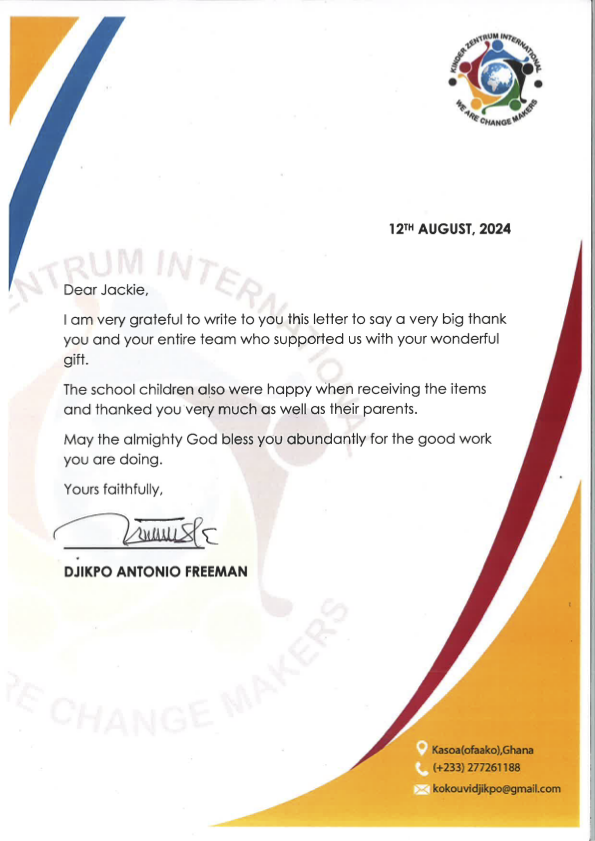 Kinder Zentrum International School is a free non-paying school. Jackie meeting with Antonio in Ghana July 2023 The Kinder Zentrum International School opening in November 2023